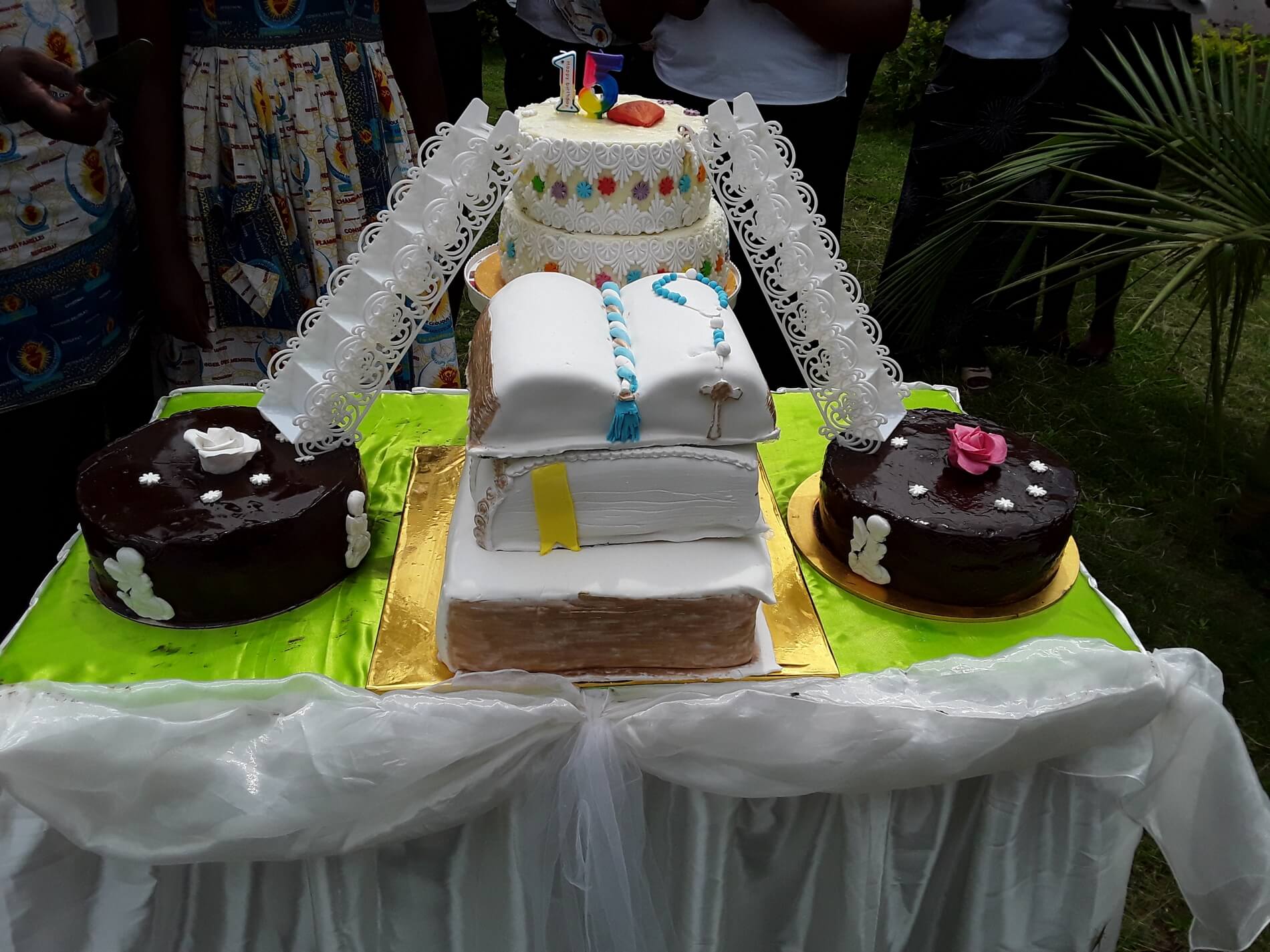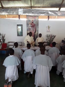 C’est dans une ambiance festive et emprunte d’émotions que les sachristins se sont regroupés pour rendre grâce au Seigneur pour les 15 ans de présence au Sanctuaire de Mvog-Beti. 15 ans d’une aventure merveilleuse sur la colline des bienheureux où le Seigneur ne cesse de combler son peuple à travers des merveilles incommensurables. Moment de joie intense et d’action de grâce à travers la célébration eucharistique présidée par l’Abbé Ferdinand Ngambi, ouvrier de la première heure et témoin privilégié de cette journée mémorable du 29 mai 2004. A ces côtés, l’Abbé Guy Serge Owona, ouvrier de la dernière heure qui a délivré en guise d’homélie, un enseignement sur les exigences de la vie communautaire qui se traduisent par la nécessité d’être UN et de tous mettre en commun pour le bon accomplissement de la mission confiée par le Seigneur. La fin de la messe a ouvert la plage festive avec le récit par quinze anciens des premiers moments de la communauté à la nouvelle génération symbolisée par quinze jeunes. Toutes ces personnes se mettront autour de l’immense gâteau offert gracieusement par une sachristine à cet effet, pour souffler sur la 15ième bougie.