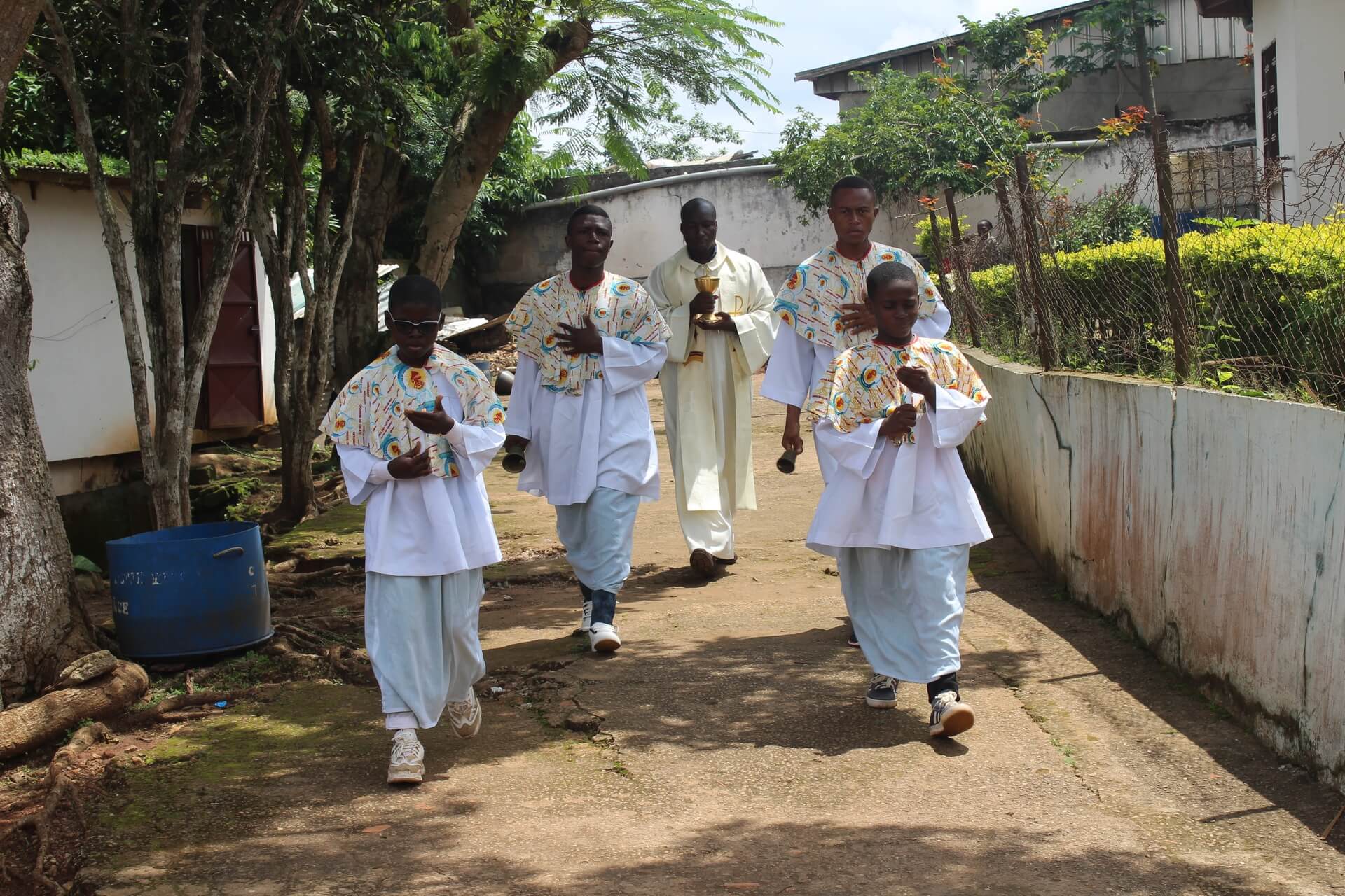 Si le chantier de construction du sanctuaire est ainsi ébranlé, nous devons dire que le premier défi ne fut pas d’y implanter des murs et des tôles… mais davantage d’y bâtir une communauté d’Église. Pour cela, le groupe s’attache à la Paroisse Saint Jean-Marc de Mvog-Beti et à son Curé de l’époque, l’Abbé Dieudonné AHANG EVINI de regrettée mémoire. L’histoire de notre jeune communauté retiendra que c’est ce brave prêtre qui viendra installer le Très Saint Sacrement de manière permanente au Sanctuaire de la Communauté des Béatitudes, en y présidant la première adoration. Il sera le tout premier prêtre à donner un enseignement aux Béatitudes pour l’ouverture du tout premier Chapitre Général annuel de la Communauté, organisé sur le thème : « La gestion des communautés dans l’Eglise ». Il faut aussi souligner que c’est l’Abbé Dieudonné qui nous a encouragés à rester solidaires et fidèles à la Sainte Eglise Catholique, et à nous laisser guider par elle. Pour cela, il se chargera lui-même d’organiser les premiers rendez-vous entre les responsables de la nouvelle communauté et la très haute hiérarchie de l’Eglise, dans l’Archidiocèse de Yaoundé. Ces rendez-vous ont souvent eu pour cadre, la Centrale Diocésaine des Œuvres (CDO). Le chantier était vaste avec lui et le voilà qui est arraché à la vie.