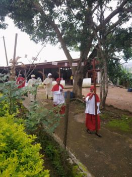 C’était une journée marathon sur la colline avec sur scène, trois prêtres, les Groupes de vie et les membres du collège de prière. Apres une brève prise de parole du Modérateur Général sur le respect des mesures barrières pour se prémunir de la Covid 19 qui fait des ravages, la journée pouvait alors commencer. Les Groupes de vie les Séraphins, les Chérubins et les Trônes ouvrent le bal avec la première messe, présidée par l’Abbé Emerant Ebale dès 10 heures et 30 minutes.